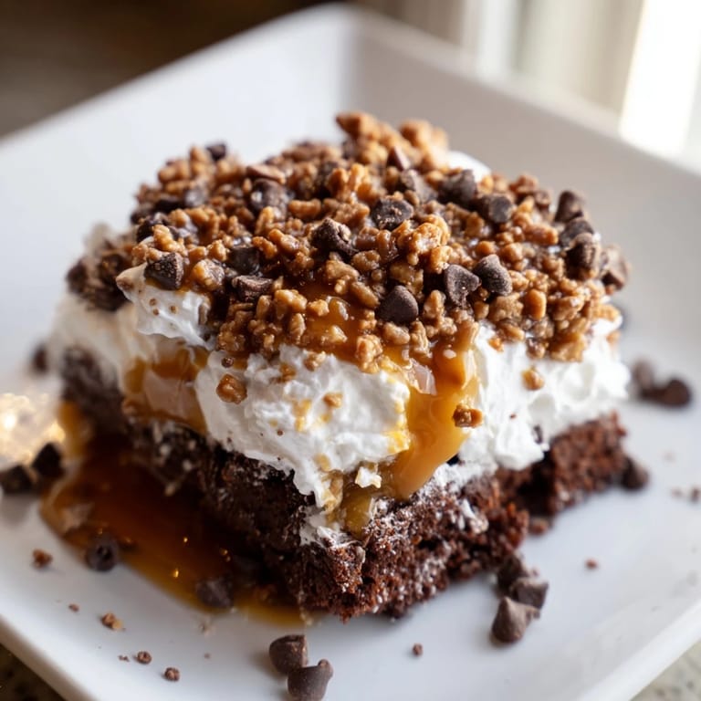 - Spread the thawed whipped topping evenly over the chilled cake using a spatula, then sprinkle the toffee bits and chocolate chips over the top. Just before serving, drizzle with that reserved caramel sauce so it looks intentional and delicious.