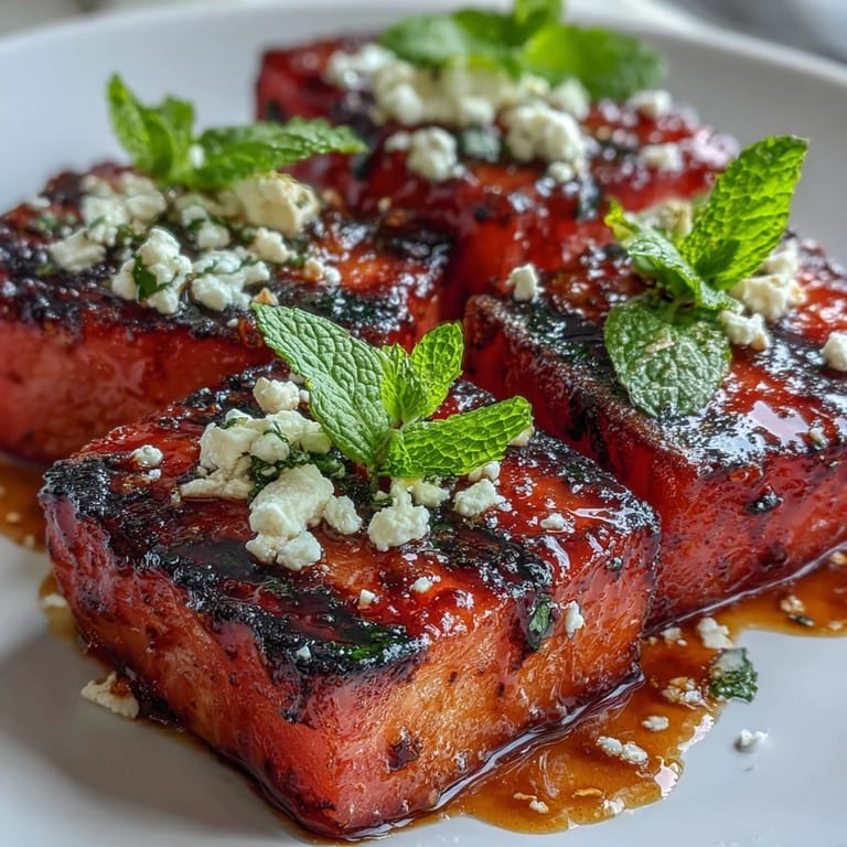 Save One sweltering July afternoon, my neighbor brought over a watermelon so massive it barely fit on my kitchen counter, and I had no idea what to do with it beyond the usual fruit salad. Out of curiosity and desperation, I threw a wedge on the grill while heating it up for dinner, and the smell that emerged—sweet, caramelized, almost honeyed—stopped me in my tracks. That single wedge, paired with some feta I had lingering in the fridge and mint from my garden, became the most unexpectedly elegant thing I'd served all summer. Now this salad shows up at every barbecue, and people always ask for the recipe like I've discovered something revolutionary.