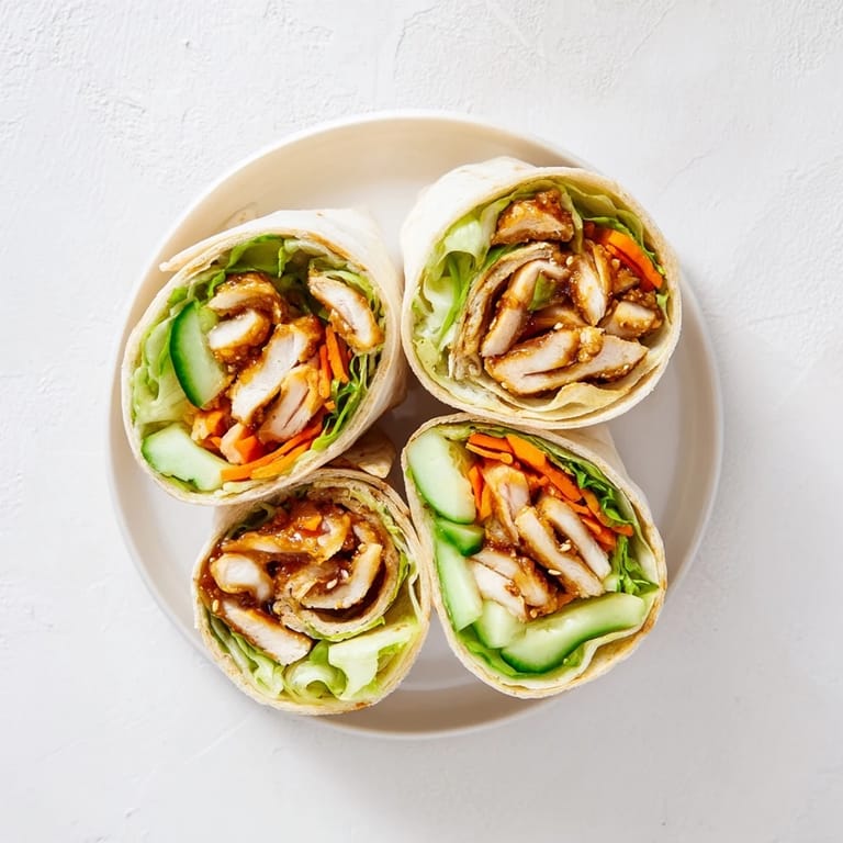 Save I stumbled onto this combination accidentally during a chaotic weekday lunch break, staring at a nearly empty fridge and a jar of chili crisp someone had gifted me months prior. The chicken was already sizzling in the pan, my stomach was making its presence known, and I thought why not just see what happens. That first bite stopped me mid-chew. The sweet heat hit first, then the crunch of vegetables, and suddenly my frantic Tuesday felt like a deliberate choice. Now it is the wrap I make when I want food that feels like a hug and an adventure all at once.