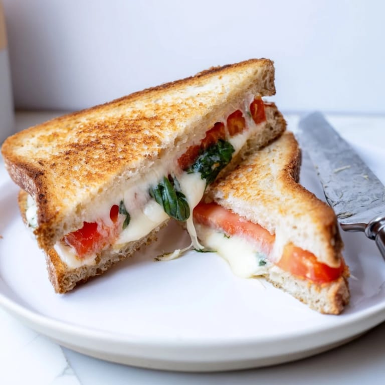 Save My cousin showed up one rainy Tuesday with a bag of tomatoes from her garden and a block of mozzarella she swore would change my life. I was skeptical until she made this sandwich in under fifteen minutes while we caught up over mugs of tea. The smell of toasted butter and melting cheese filled the kitchen, and when I bit into that first triangle, warm and crispy with the basil releasing its perfume, I understood why she drove across town just to share it.